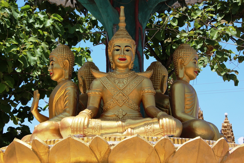 Some very golden Buddhas sitting meditating under the Buddha tree.