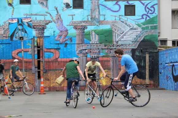Discovering bike polo before the storm – boy, can the wind blow a hooly here when it wants – the wind was so strong that we did not need to paddle. Herbie cunningly sheltering in a play tunnel.