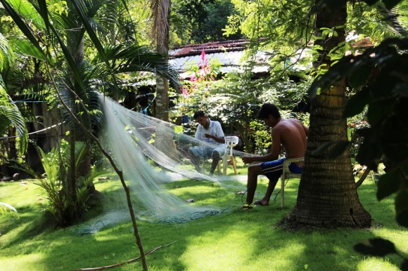 A very friendly family offer us their rancho to stay in. Next morning the men of the house meticulously mend fishing nets in the garden.