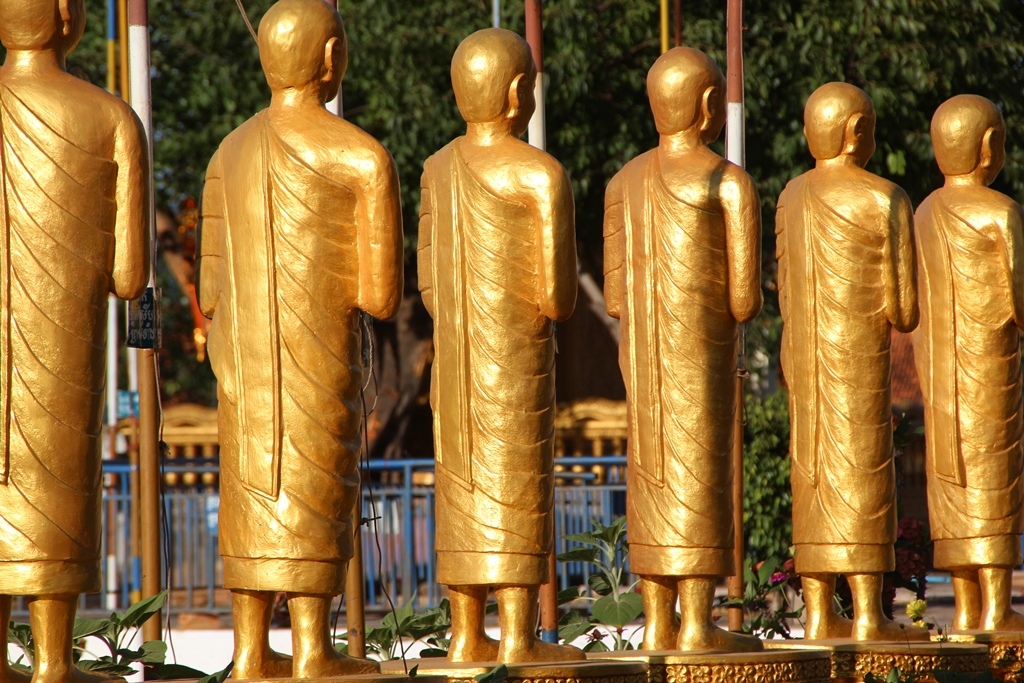 Beautiful row of golden monks facing the Wat in Pailin but unlike dominoes these ones are unlikely to topple over!