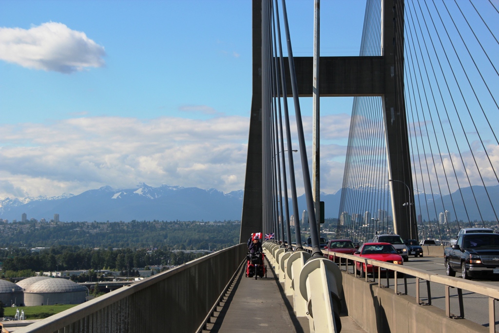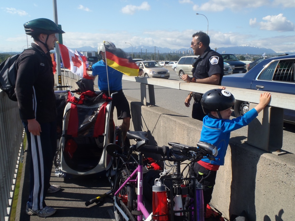 Somehow we lost track of the cycle path and ended up on the 6 lane highway over The Alex Fraser Bridge – good job it was rush hour so everything was jammed! Had just decided to lift all our stuff over the barrier to the cycle path when a police car stopped. We were ready with a string of excuses but he just asked “need a helping hand?”