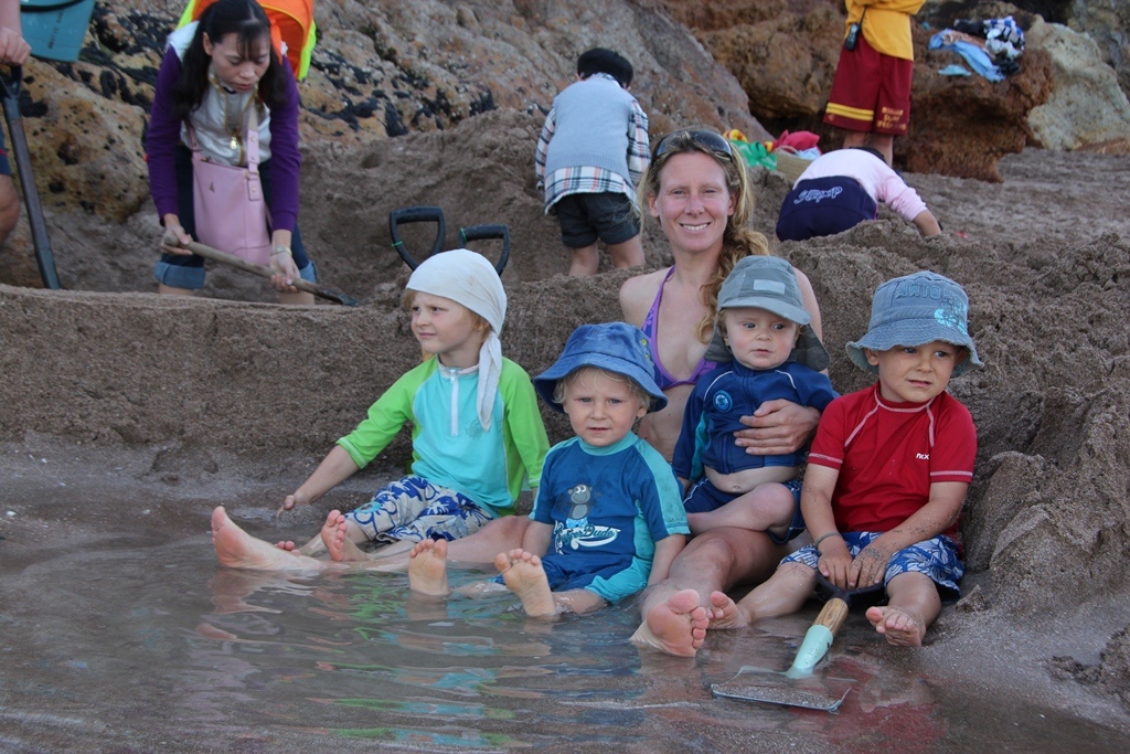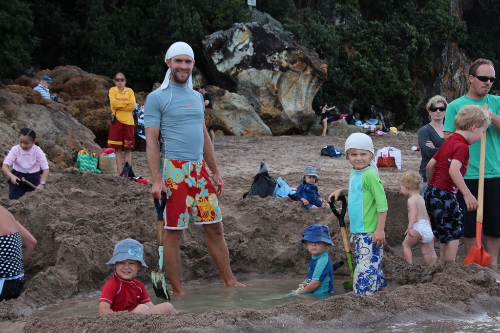 Digging hot pools at the thermal springs at Hot Water Beach – you have to be careful not to dig too deep!