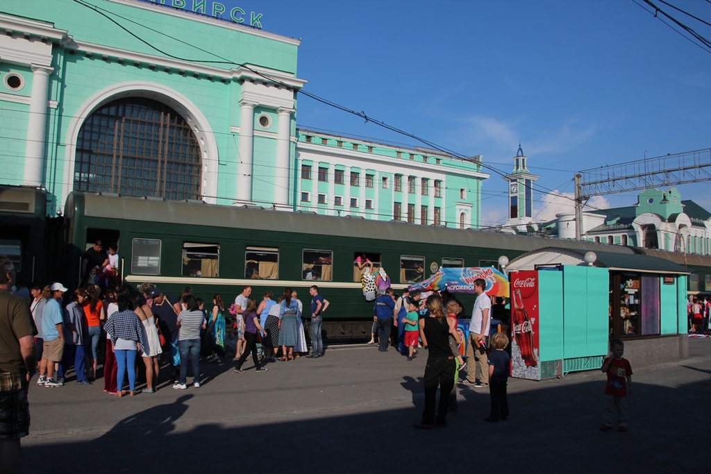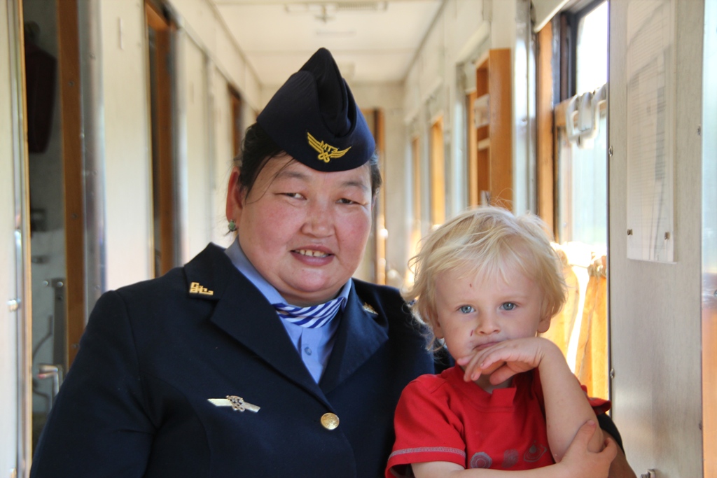 Stretching our legs on firm ground at an intermediary stop. The crowd of people are not boarding the train but buying clothes and blankets from the Mongolian market traders on board and this is the practice at every station. Note the models hanging from the window!