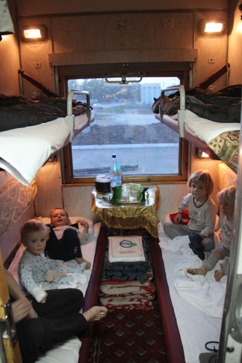 Ready to hop into their bunks – the boys have got very used to sleeping on board trains!