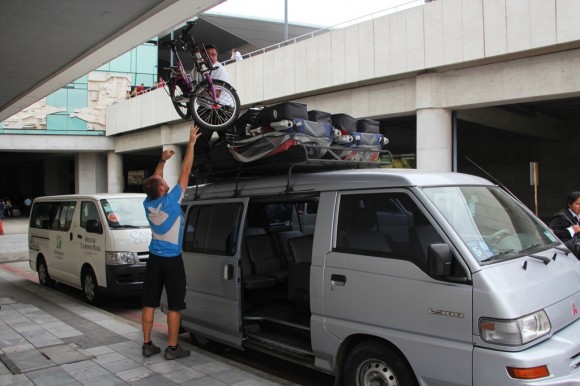 On the way to the national airport loaded up with cardboard to tape around the bikes.