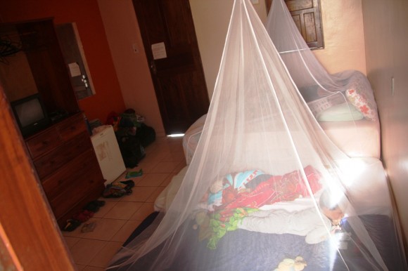 Mosquito nets up and time for a good night story before everyone goes to bed.
