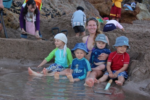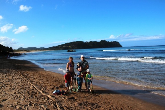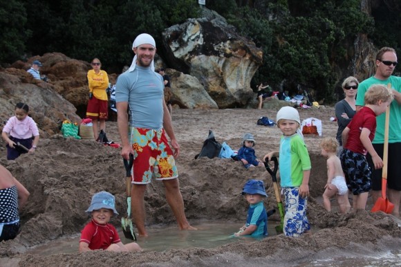 Digging hot pools at the thermal springs at Hot Water Beach – you have to be careful not to dig too deep!