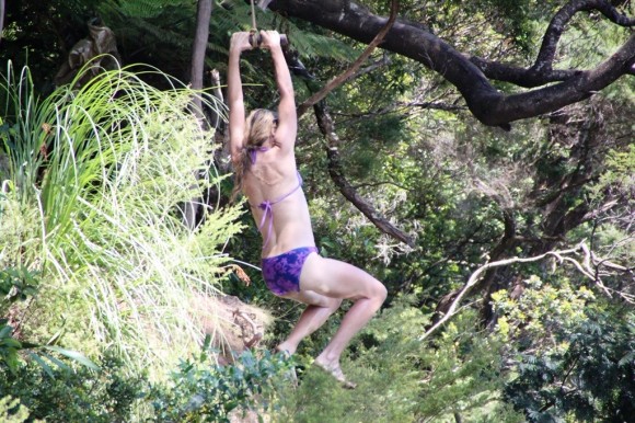 The parents getting a turn on the rope swing over this swimming hole on this occasion.